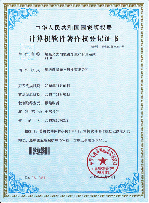 廊坊耀星光電科技有限公司成立于2016年,依托京津冀的地緣、信息、人才等優勢,憑借科學人性化管理理念,廣招人才,以各種獎勵手段激發團隊創新精神。公司是一個集研發、設計、生產制造、銷售服務和工程安裝于一體的企業。公司注冊資金3688萬,擁有多項照明類**、軟著等知識產權。公司主要生產升降高桿燈、太陽能路燈、景觀燈以及LED環保節能燈具,經過多年來的不懈努力,憑借優良的產品質量及完善的售后服務,得到了國內外電力及照明行業好評。
