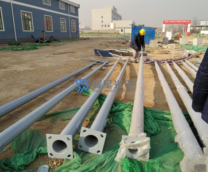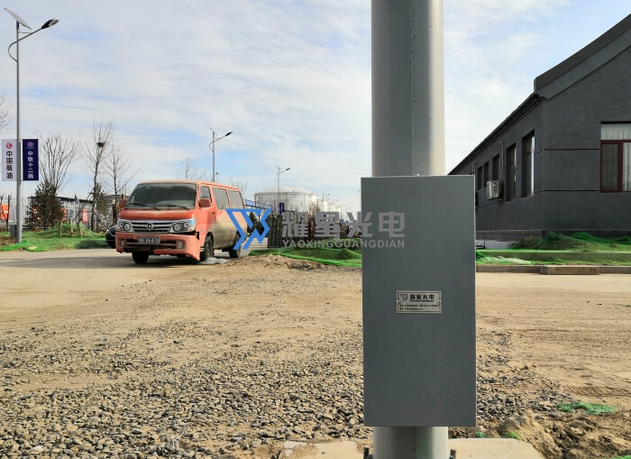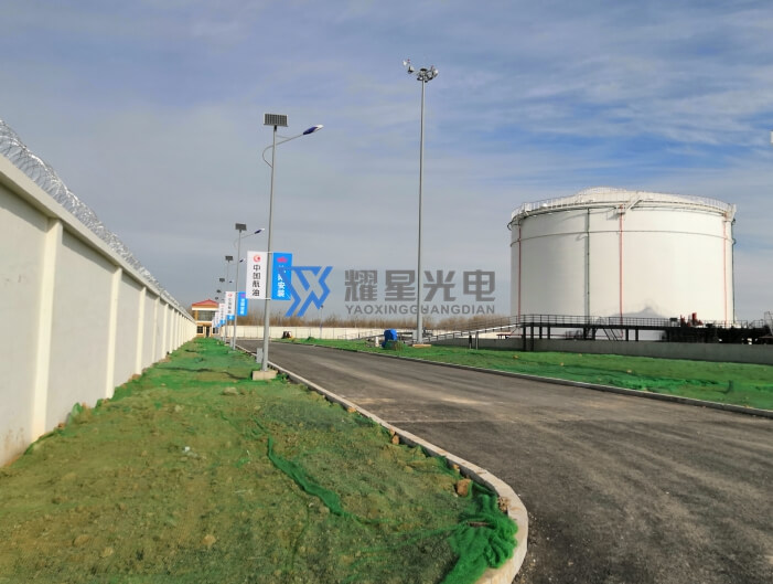 北京首都機(jī)場油庫區(qū)照明工程,場區(qū)共配置5套30米升降高桿燈和116套8米市電互補(bǔ)太陽能路燈